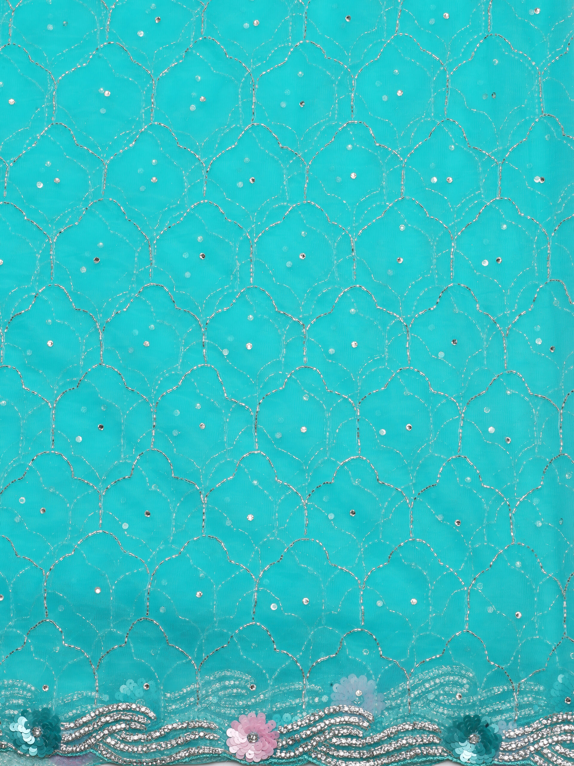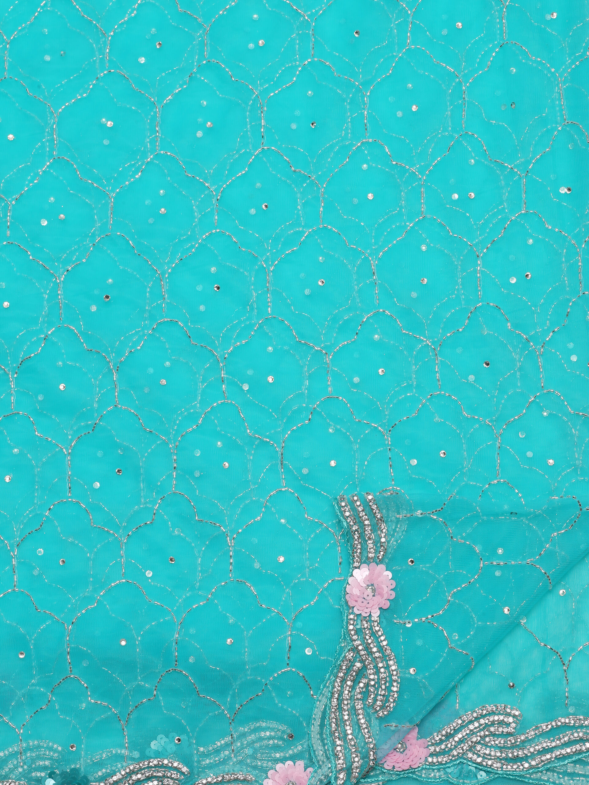 Step into elegance with this stunning blue saree crafted from soft net fabric. Designed with intricate all-over embroidery and a scalloped main border, it brings together tradition and glamour. Delicate floral accents and shimmering details make it perfect for festive occasions, parties, or wedding functions.
